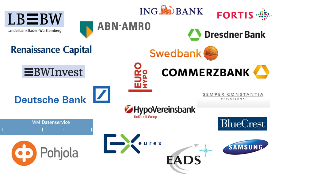 Deutsche Bank, Commerzbank, LBBW, LBBW Asset Management, Hypovereinsbank, HSH Nordbank, EUREX (Deutsche Börse), Fortis, ABN Amro, ING, Rabobank International, Semper Constantia, Pohjola, Swedbank, Renaissance Capital, Westpac, BlueCrest sowie EADS, Samsung, Posco, Azzawiya Oil Rafinnery and Boudjebel VACPA